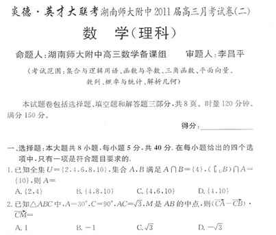 湖南省师大附中2011届高三上学期月考试卷(二)(数学理)扫描版