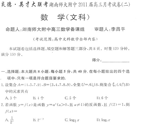 湖南省师大附中2011届高三上学期月考试卷(二)(数学文)扫描版