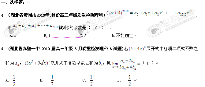 湖北省各地市2010年高考数学最新联考试题分类大汇编(12)二项式定理