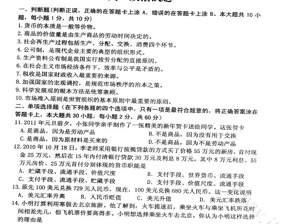 江苏省南通市10-11学年高一上学期期末考试(政治)扫描版缺答案