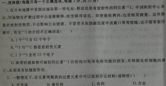 辽宁省沈阳二中10-11学年高一下学期期中考试扫描版(化学)