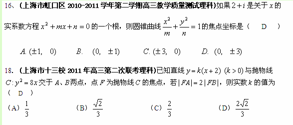 上海市各地市2011年高考最新联考分类汇编(10)圆锥曲线