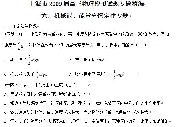 上海市2009届高三模拟试题精编——机械能、能量守恒定律