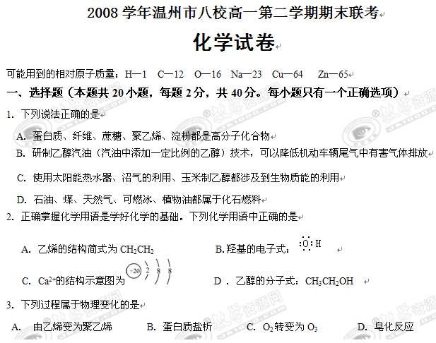 浙江省温州市八校08-09学年高一下学期期末联考(化学)