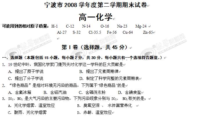 浙江省宁波市08-09学年高一下学期期末考试(化学)