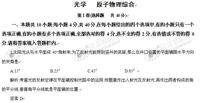 物理:《光学 原子物理综合》单元测试(新人教版选修3-4)