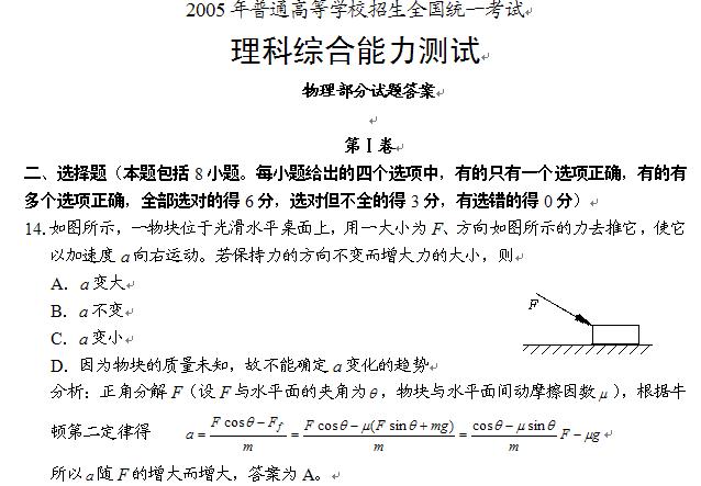 甘肃省2005年高考理综Ⅲ(物理部分逐题精析)