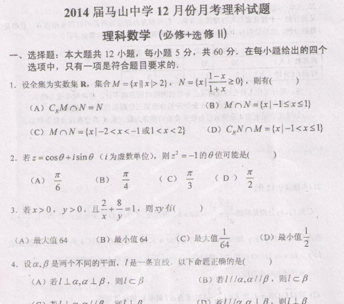 广西南宁市马山中学2014届高三12月月考(数学理)扫描版