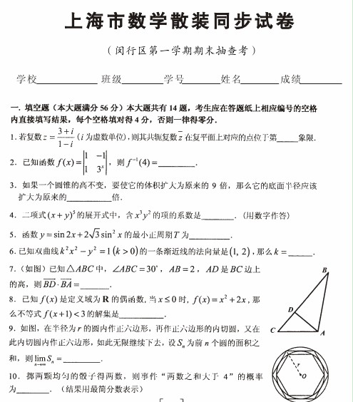 【2014上海闵行一模】上海市闵行区2014届高三上学期期末考试(一模)(数学)扫描版无答案