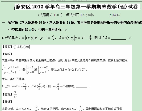 【2014上海静安一模】上海市静安区2014届高三上学期期末考试(一模)(数学理)(解析版)