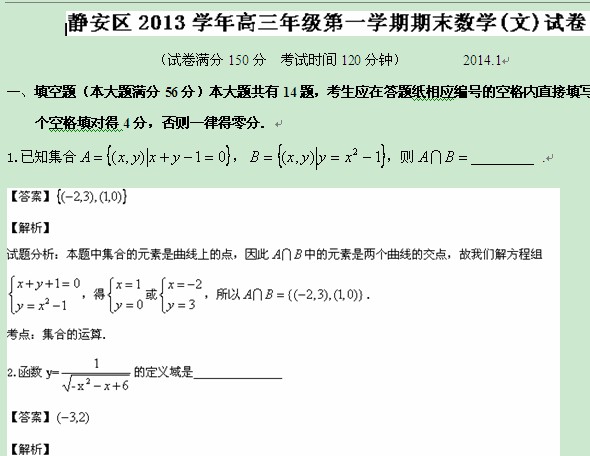 【2014上海静安一模】上海市静安区2014届高三上学期期末考试(一模)(数学文)(解析版)