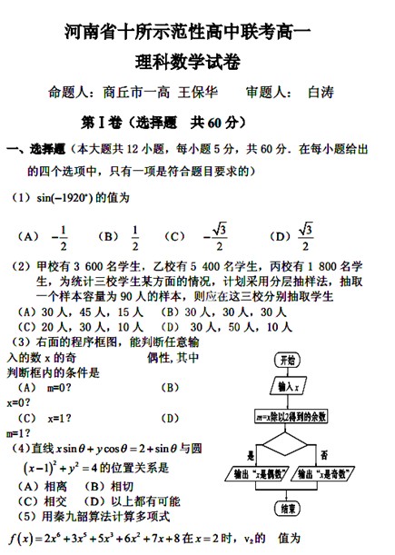 河南省2013-2014学年高一下学期十所示范性高中联考(数学理)扫描版