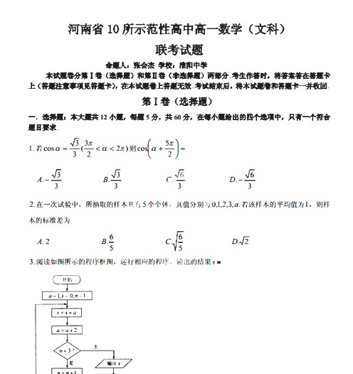 河南省2013-2014学年高一下学期十所示范性高中联考(数学文)扫描版