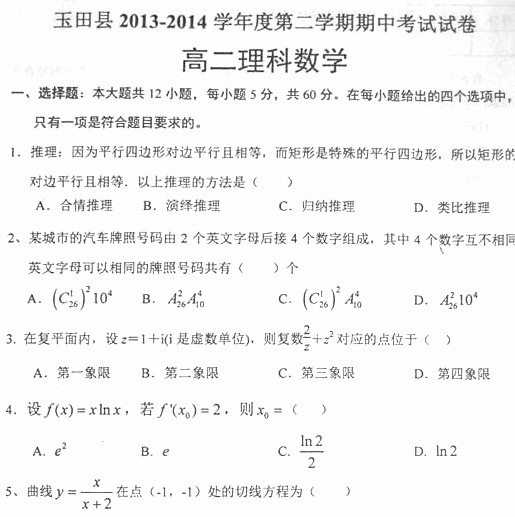 河北省玉田县2013-2014学年高二下学期期中考试(数学理)扫描版