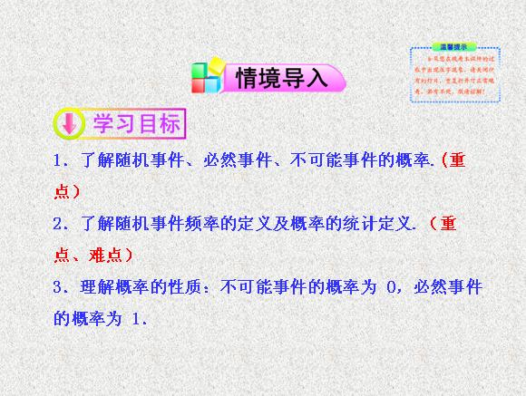 2013版高中数学全程学习夺冠方略多媒体课件:3.1.2 随机事件的概率(苏教版必修3)