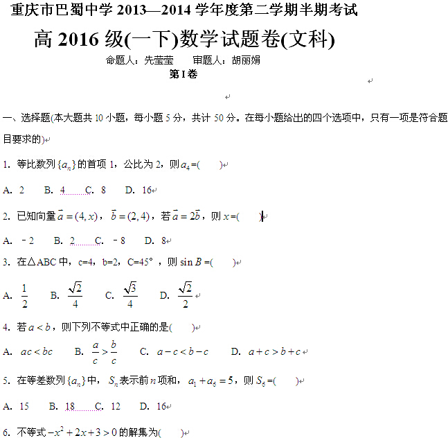 重庆市巴蜀中学2013-2014学年高一下学期期中考试(数学文)缺答案
