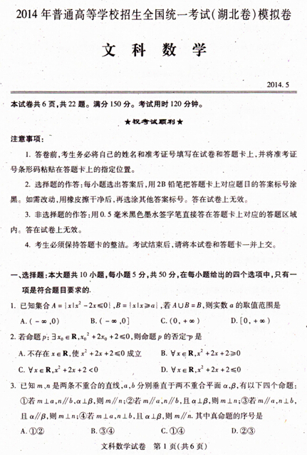 湖北省2014届高三毕业生五月考前模拟(数学文)扫描版