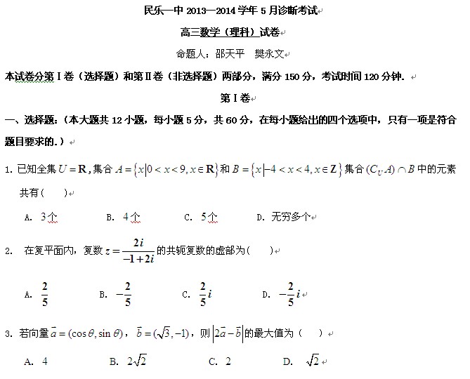 甘肃省张掖市民乐一中2014届高三5月诊断考试(数学理)