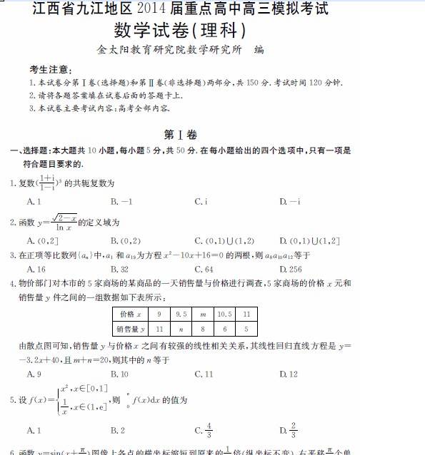 江西省九江地区2014届高三重点高中模拟考试 (数学理)扫描版