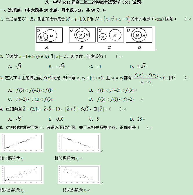 江西省南昌市八一中学2014届高三第三次模拟考试(数学文)
