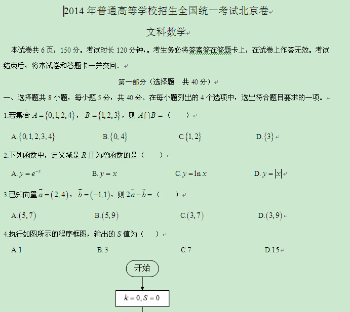 2014年普通高等学校招生全国统一考试北京卷(数学文)word版含答案