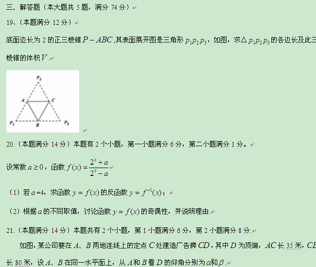 2014年普通高等学校招生全国统一考试上海卷(数学理)Word版缺答案(仅解答题)