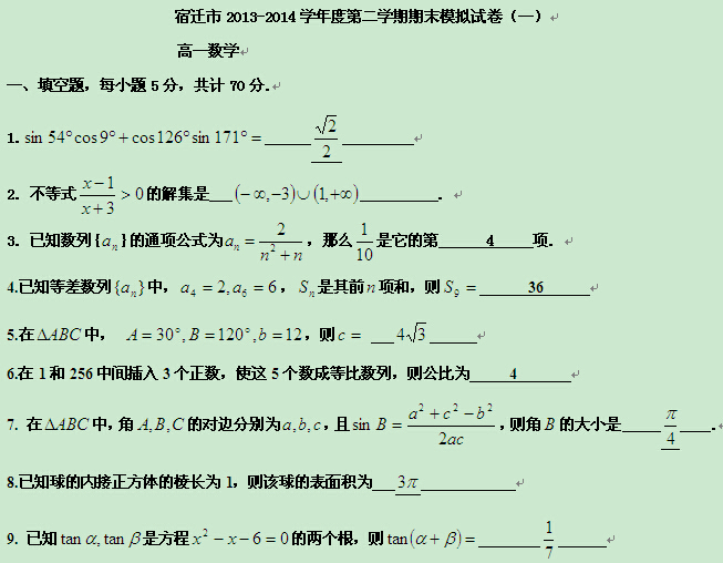 江苏省宿迁市2013-2014学年高一下学期期末模拟(数学)
