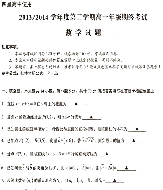 江苏省盐城市2013-2014学年高一下学期期末考试试题(数学)扫描版缺答案