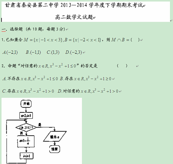 甘肃省天水市秦安二中2013-2014学年高二下学期期末考试(数学文)