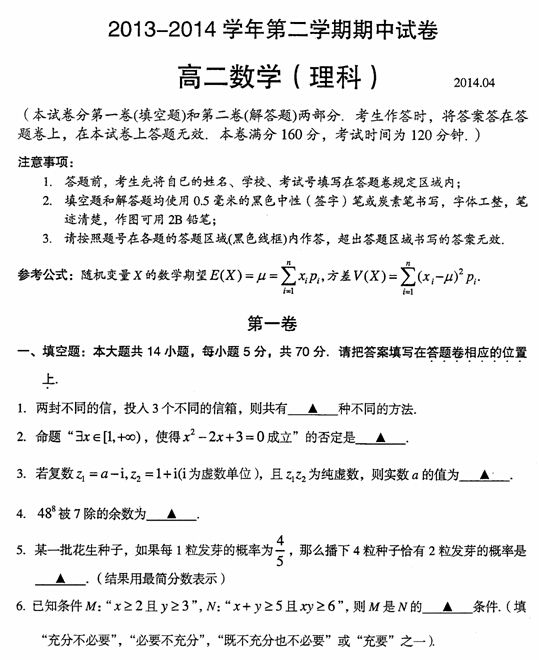 江苏省常熟中学2013-2014学年高二下学期期中考试(数学理)扫描版