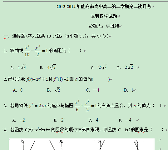 陕西省商洛市商南县高级中学2013-2014学年高二下学期第二次月考(数学文)缺答案
