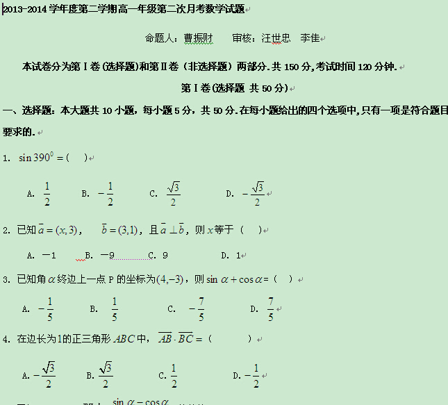 陕西省商洛市商南县高级中学2013-2014学年高一下学期第二次月考(数学)缺答案