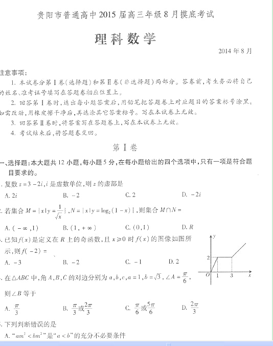 贵州省贵阳市普通高中2015届高三8月摸底考试(数学理)扫描版