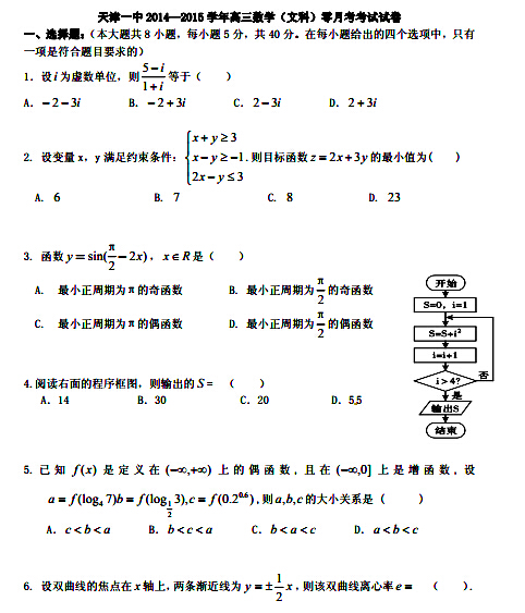 天津市天津一中2015届高三零月考(数学文)扫描版