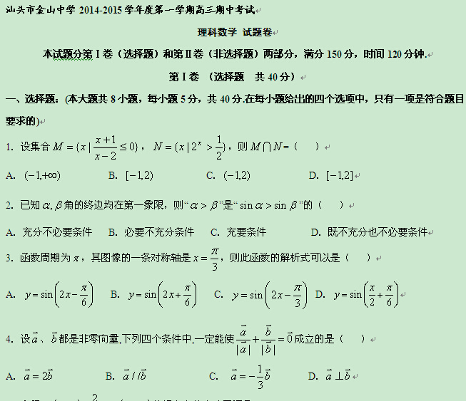 广东省汕头市金山中学2015届高三第一学期期中考试(数学理)