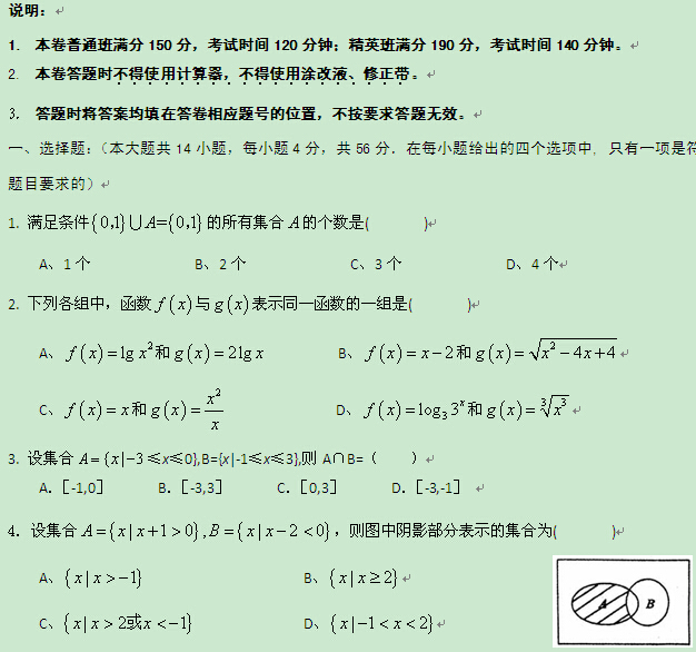 山西省长治县一中学校2014-2015学年高一上学期期中考试(数学)