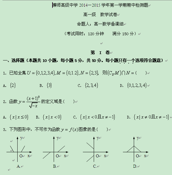 广东省博罗县博师高级中学2014-2015学年高一第一学期期中考(数学)