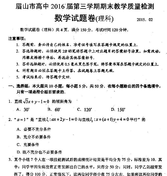 四川省眉山市高中2016届第三学期期末教学质量检测(数学理)
