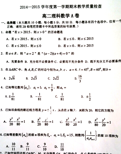 广东省东莞市南开实验学校2014-2015学年高二上学期期末教学质量检查(数学理)(扫描版,无答案)
